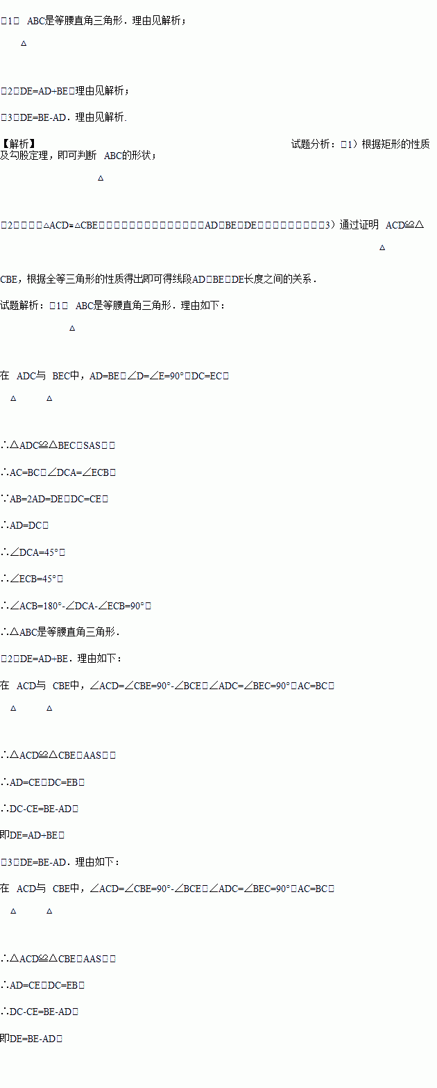 (2)保持图1中△ABC固定不变,绕点C旋转DE所在的直线MN到图2中(当垂线段AD、BE在直线MN的同侧),试探究线段AD、BE、DE长度之间有什么关系?并给予证明;