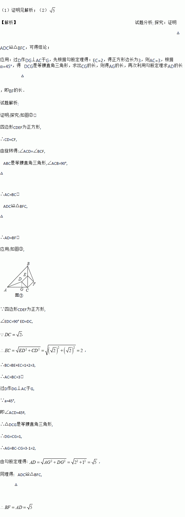探究:将图①的正方形CDEF绕点C顺时针旋转α(0°<α<90°),连接AD、BF,其他条件不变,如图②,求证:AD=BF;