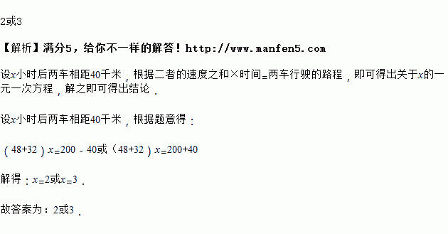 A,B 两地相距 200 千米,甲车以每小时 48 千米的速度从 A 地驶向 B 地,乙车以每小时 32 千米的速度从 B地驶向 A 地,若两车同时出发,________小时后两车相距 40 千米.