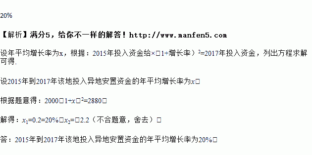 某地2015年为做好“精准扶贫”工作,投入资金2000万元用于异地安置,并规划投入资金逐年增加,2017年投入资金2880万元,求2015年到2017年该地投入异地安置资金的年平均增长率.