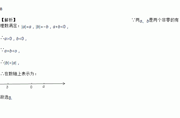 B 【解析】∵两a、b是两个非零的有理数满足:|a|=a,|b|=?b,a+b<0, ∴a>0,b<0, ∵a+b