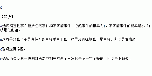 C 【解析】 A选项确定性事件包括必然事件和不可能事件,必然事件的概率为1,不可能事件的概率是0,所以是假命题。 B选项平分弦(不是直径)的直径垂直于弦,这里没有强调弦不是直径,所以是假命题。 C选项是真命题。 D选项两边及其一边的对角对应相等的两个三角形是不一定全等的,所以是假命题。用a、b、c作三角形的三边,其中不能构成直角三角形的是( )