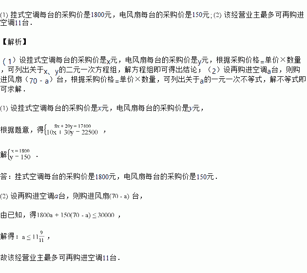 某电器经营业主两次购进一批同种型号的挂式空调和电风扇,第一次购进8台空调和20台电风扇;第二次购进10台空调和30台电风扇.若第一次用资金17400元,第二次用资金22500元,求挂式空调和电风扇每台的采购价各是多少元?![]()
