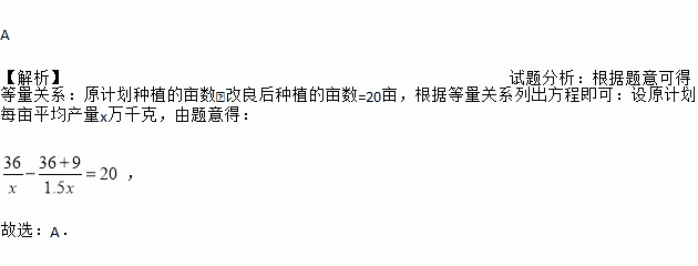 遂宁市某生态示范园,计划种植一批核桃,原计划总产量达36万千克,为了满足市场需求,现决定改良核桃品种,改良后平均每亩产量是原计划的1.5倍,总产量比原计划增加了9万千克,种植亩数减少了20亩,则原计划和改良后平均每亩产量各是多少万千克?设原计划每亩平均产量为x万千克,则改良后平均每亩产量为1.5x万千克,根据题意列方程为( )