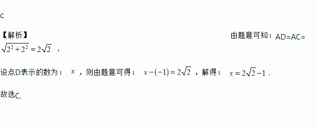 如图,数轴上的点A表示的数是-1,点B表示的数是1,CB⊥AB于点B,且BC=2,以点A为圆心,AC为半径画弧交数轴于点D,则点D表示的数为( )