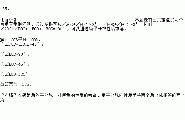 如图所示,两块三角板的直角顶点O重叠在一起,且OB恰好平分∠COD,则∠AOD的度数是____________.