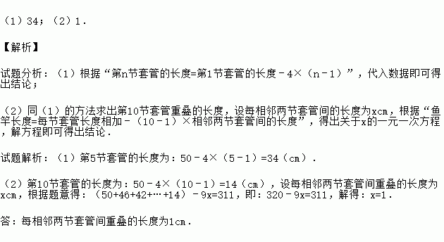 (1)34;(2)1. 【解析】 试题分析:(1)根据“第n节套管的长度=第1节套管的长度﹣4×(n﹣1)”,代入数据即可得出结论; (2)同(1)的方法求出第10节套管重叠的长度,设每相邻两节套管间的长度为xcm,根据“鱼竿长度=每节套管长度相加﹣(10﹣1)×相邻两节套管间的长度”,得出关于x的一元一次方程,解方程即可得出结论. 试题解析:(1)第5节套管的长度为:50...