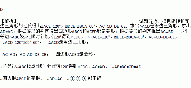 D. 【解析】试题分析:根据旋转和等边三角形的性质得出∠ACE=120°,∠DCE=∠BCA=60°,AC=CD=DE=CE,求出△ACD是等边三角形,求出AD=AC,根据菱形的判定得出四边形ABCD和ACED都是菱形,根据菱形的判定推出AC⊥BD. ∵将等边△ABC绕点C顺时针旋转120°得到△EDC, ∴∠ACE=120°,∠DCE=∠BCA=60°,AC=CD=DE=CE, ∴∠ACD...