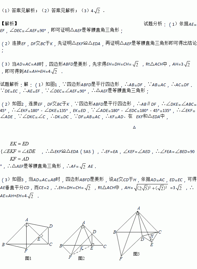 如图1,在等腰Rt△ABC中,∠BAC=90°,点E在AC上(且不与点A、C重合).在△ABC的外部作等腰Rt△CED,使∠CED=90°,连接AD,分别以AB,AD为邻边作平行四边形ABFD,连接AF.