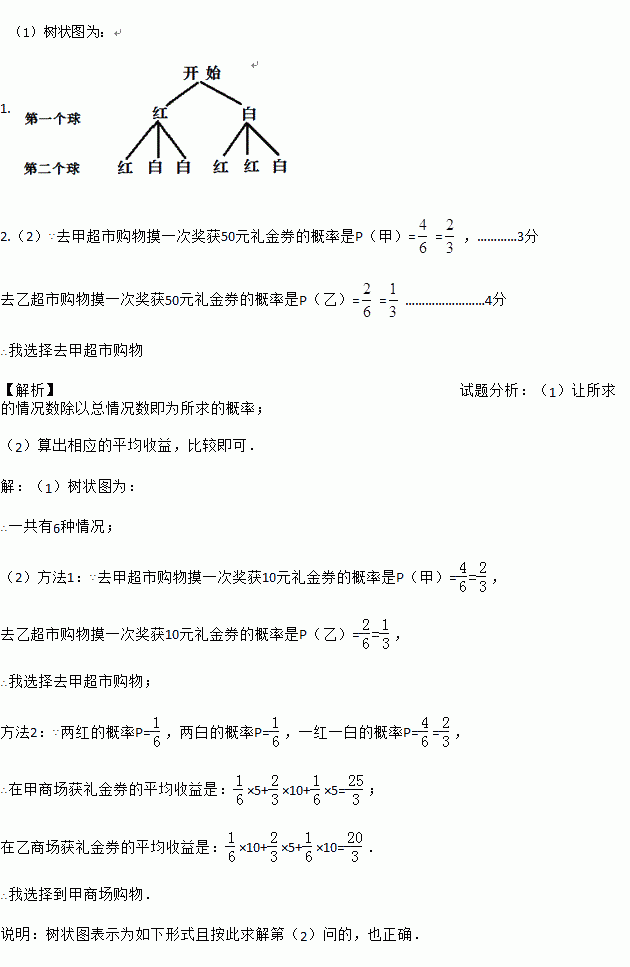 甲、乙两大型超市为了吸引顾客,都举行有奖酬宾活动,凡购物满200元,均可得到一次抽奖的机会,在一个纸盒里装有2个红球和2个白球,除颜色外其它都相同,抽奖者一次从中摸出两个球,根据球的颜色决定送礼金券(在他们超市使用时,与人民币等值)的多少(如下表).