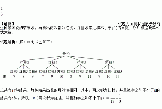有四张扑克牌,分别为红桃3、红桃4、红桃5、黑桃6,背面朝上洗匀后放在桌面上,从中任取一张后记下数字和颜色(不放回),再背面朝上洗匀,然后再从中随机取一张,求两次都为红桃,并且数字之和不小于8的概率.