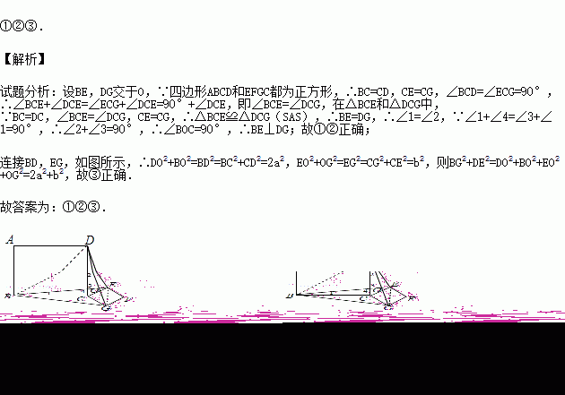 如图,正方形ABCD和正方形CEFG边长分别为a和b,正方形CEFG绕点C旋转,给出下列结论:①BE=DG;②BE⊥DG;③,其中正确结论是 (填序号)