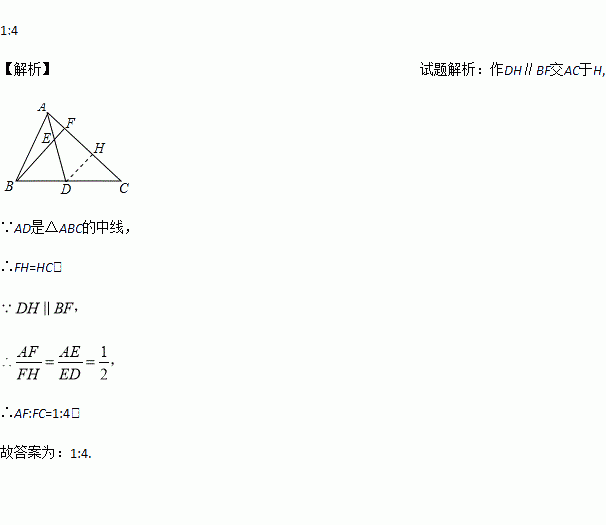 如图,AD是△ABC的中线,E是AD上一点,且AE:ED=1:2,BE的延长线交AC于F,则AF:FC=_____.