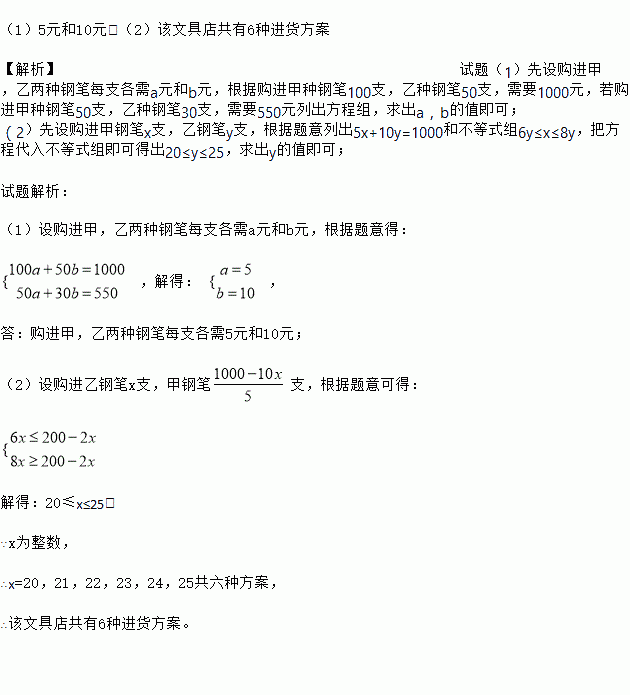 (2)若该文具店准备拿出1000元全部用来购进这两种钢笔,考虑顾客需求,要求购进甲中钢笔的数量不少于乙种钢笔数量的6倍,且不超过乙种钢笔数量的8倍,那么该文具店共有几种.