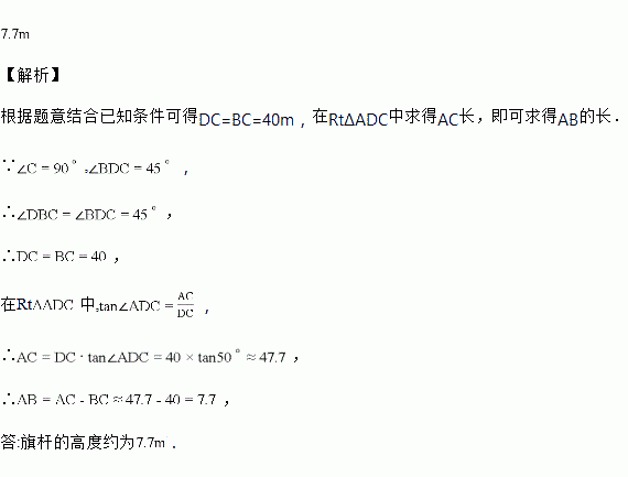 建筑物上有一旗杆,由距 的处观察旗杆顶部的仰角为观察底部的仰角为,求旗杆的高度(精确到).