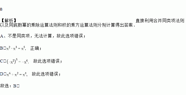 A. x2+x3=x5 B. x2•x3=x5 C. (﹣x2)3=x8 D. x6÷x2=x3