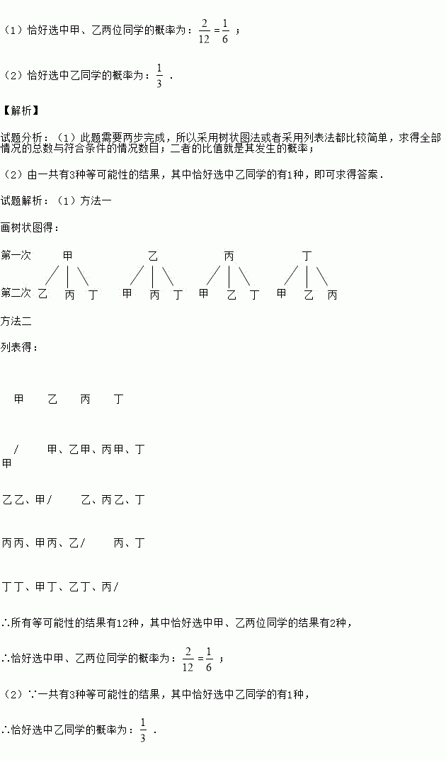 (1)请用树状图法或列表法,求恰好选中甲、乙两位同学的概率;