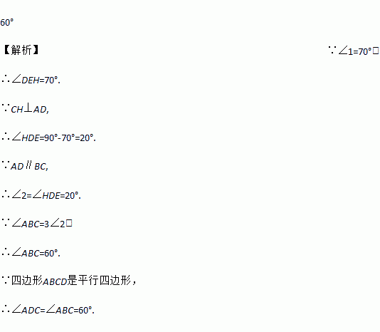 如图,在□ABCD中,CH⊥AD于点H, CH与BD的交点为E.如果∠1=70°,∠ABC=3∠2,那么∠ADC= ________
