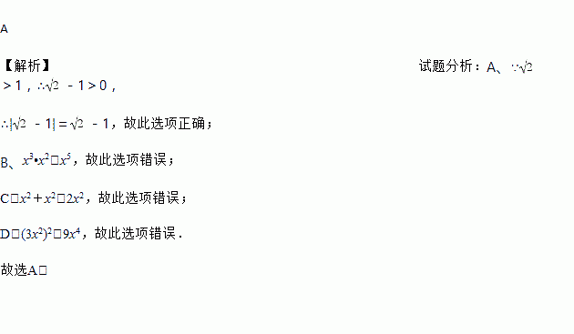 A. |-1|=-1 B. x3•x2=x6 C. x2+x2=x4 D. (3x2)2=6x4