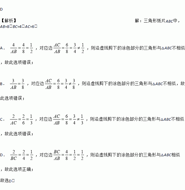 在三角形纸片ABC中,AB=8,BC=4,AC=6.按下列四种方法沿虚线剪下,能使阴影部分的三角形与△ABC相似的是( )