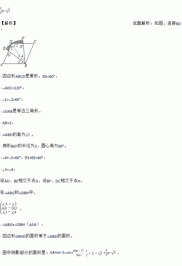 如图,四边形ABCD是菱形,∠A=60°,AB=2,扇形EBF的半径为2,圆心角为60°,则图中阴影部分的面积是 .