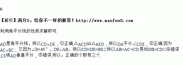 如图,△ABC中,AC=BC,∠ACB=90°,AD平分∠BAC,DE⊥AB,连接CE.有下列结论:①DC=DE;②DA平分∠CDE;③AB=AC+CD;④D为BC的中点;⑤AD被CE垂直平分.其中正确的个数为 ( )