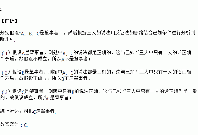 某地发生车祸,A、B、C三名司机中有一位司机肇事,警察找了A、B、C三个司机询问,A说:“是B肇事.”,B说:“不是我肇事.”,C说:“不是我肇事.”,这三个司机中只有一人说的话正确,请问,聪明的同学,你可以推断出是司机_______肇事.