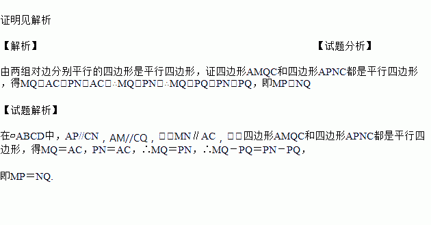 如图,在?ABCD中,MN∥AC,分别交DA,DC的延长线于点M,N,交AB,BC于点P,Q,