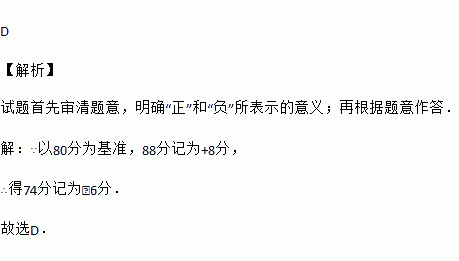 有一种记分方法:以80分为准,88分记为+8分,某同学得分为74分,则应记为( )
