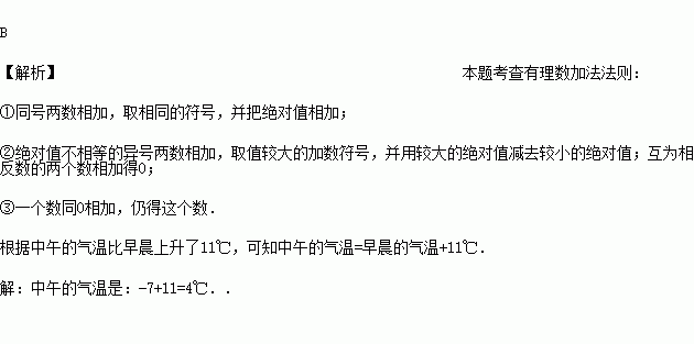 一天早晨的气温是-7℃,中午的气温比早晨上升了11℃,中午的气温是( )