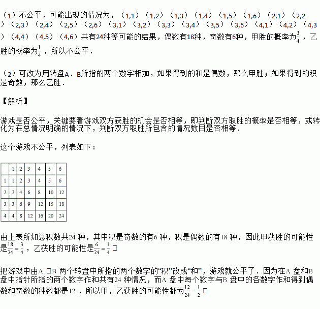 ͬʱ×ÔÓÉת¶¯×ªÅÌAÓëBתÅÌÍ£Ö¹ºó£¬Ö¸Õë¸÷Ö¸ÏòÒ»¸öÊý×Ö£¨Èç¹ûÖ¸ÕëÇ¡ºÃÖ¸ÔÚ·Ö¸ñÏßÉÏ£¬ÄÇÃ´ÖØ×ªÒ»´Î£¬Ö±µ½Ö¸ÕëÍ£ÁôÔÚijһÊý×ÖΪֹ£©£¬ÓÃËùÖ¸µÄÁ½¸öÊý×Ö×÷³Ë»ý£¬Èç¹ûµÃµ½µÄ»ýÊÇżÊý£¬ÄÇô¼×ʤ£»Èç¹ûµÃµ½µÄ»ýÊÇÆæÊý£¬ÄÇôÒÒʤ£¨ÈçתÅÌAÖ¸ÕëÖ¸Ïò3£¬×ªÅÌBÖ¸ÕëÖ¸Ïò5£¬3¡Á5£½15£¬°´¹æÔòÒÒʤ£©¡£ÄãÈÏΪÕâÑùµÄ¹æÔòÊÇ·ñ¹«Æ½£¿Çë˵Ã÷ÀíÓÉ£»Èç¹û²»¹«Æ½£¬ÇëÄãÉè¼ÆÒ»¸ö¹«Æ½µÄ¹æÔò£¬²¢ËµÃ÷ÀíÓÉ¡£