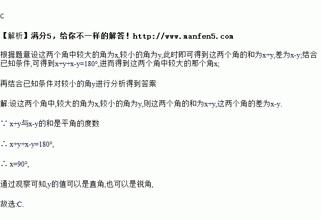 若两个角的和与这两个角的差之和是一个平角的度数,则这两个角( )