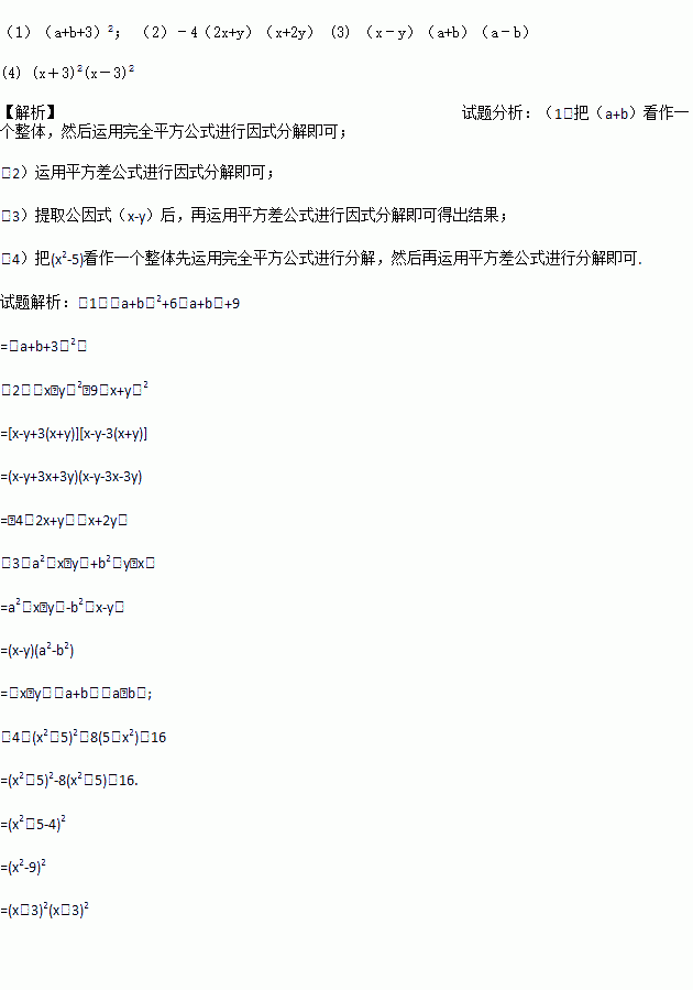 (1)(a+b+3)2; (2)﹣4(2x+y)(x+2y) (3) (x﹣y)(a+b)(a﹣b) (4) (x+3)2(x-3)2 【解析】试题分析:(1)把(a+b)看作一个整体,然后运用完全平方公式进行因式分解即可; (2)运用平方差公式进行因式分解即可; (3)提取公因式(x-y)后,再运用平方差公式进行因式分解即可得出结果; (4)把(x2-5)看作一个整...计算