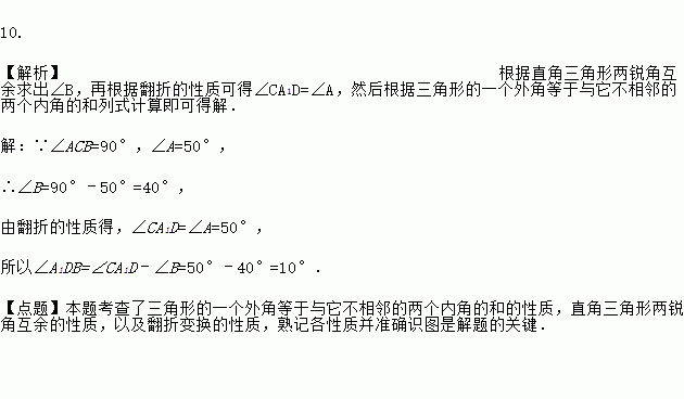 查看答案如图,△ABC中,∠ACB=90°,∠A=50°,将其折叠,使点A落在边BC上A1处,折痕为CD,则∠A1DB=__度.
