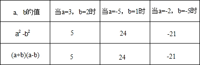 当a=-2,b=-5时,a2-b2=(-2)2-(-5)2=4-25=-21,(a+b)(a-b)=(-2-5)×(-2+5)=-21;
