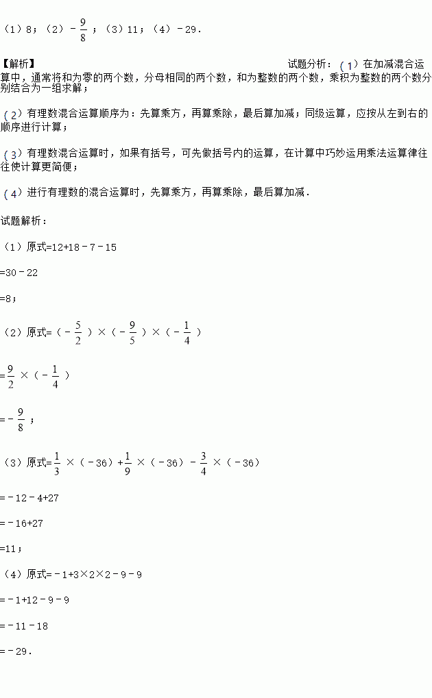 (1)12﹣(﹣18)+(﹣7)﹣15