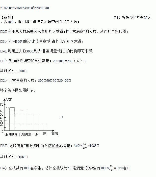 (4)若该校共有3000名学生,估计全校认为“非常满意”的学生有多少名?