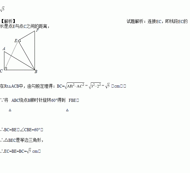 如图,在△ABC中,∠C=90°,AC=2cm,AB=3cm,将△ABC绕点B顺时针旋转60°得到△FBE,则点E与点C之间的距离是_________cm.