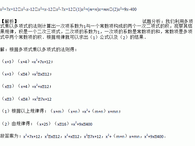 x2+7x+12;x2-x-12;x2+x-12;x2-7x+12;(1)x2+(m+n)x+mn;(2)x2+9x-400 【解析】试题分析:我们利用多项式乘以多项式的法则计算出一次项系数为1与一个常数项构成的两个一次二项式的积,观察其结果规律,积是一个二次三项式,二次项的系数为1,一次项的系数是常数项的和,常数项是多项式中两个常数项的积.根据规律就可以求出(1)公式以及(2)的结果. ...