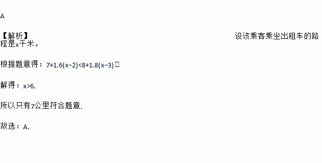 A 【解析】设该乘客乘坐出租车的路程是x千米, 根据题意得:7+1.6(x?2)<8+1.8(x?3), 解得:x>6. 所以只有7公里符合题意. 故选:A.