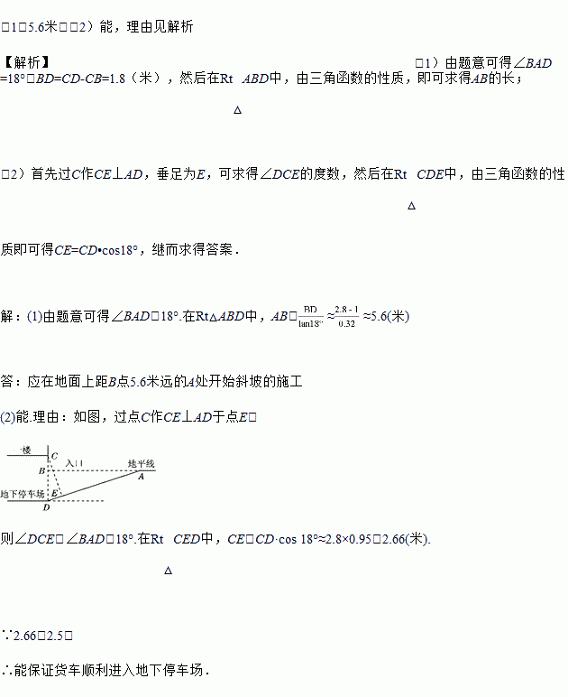 (2)如果给该商场送货的货车高度为2.5米,那么按这样的设计能否保证货车顺利进入地下停车场?请说明理由.(参考数据:sin 18°≈0.31,cos 18°≈0.95,tan 18°≈0.32)