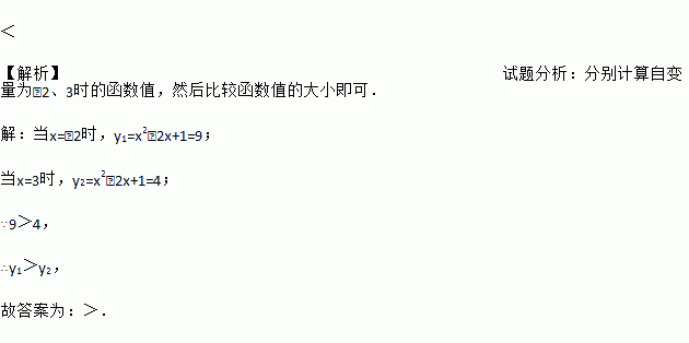 点A(2,y1)、B(3,y2)是二次函数y=x2﹣2x+1的图象上两点,则y1与y2的大小关系为y1________y2(填“>”、“<”、“=”).