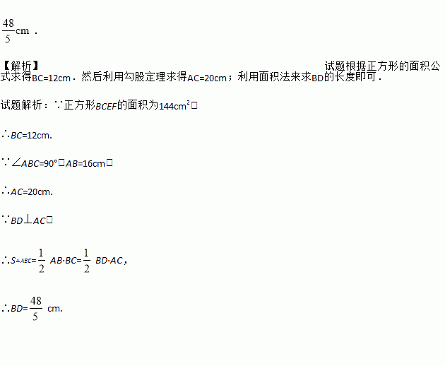 如图,在Rt△ABC中,∠ABC=90°,AB=16cm,正方形BCEF的面积为144cm2,BD⊥AC于点D,求BD的长.