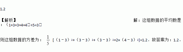 1.2 【解析】【解析】 这组数据的平均数是:(1+3+3+4+4)÷5=3, 则这组数据的方差为: [(1﹣3)2+(3﹣3)2+(3﹣3)2+2×(4﹣3)2]=1.2.故答案为:1.2.