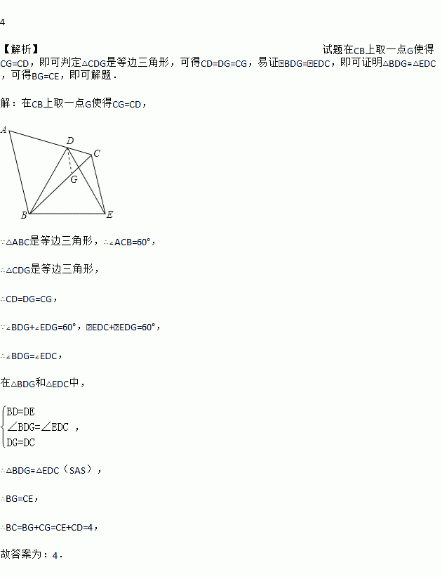 如图,△ABC是等边三角形,点D为 AC边上一点,以BD为边作等边△BDE, 连接CE.若CD=1,CE=3,则BC=_____.