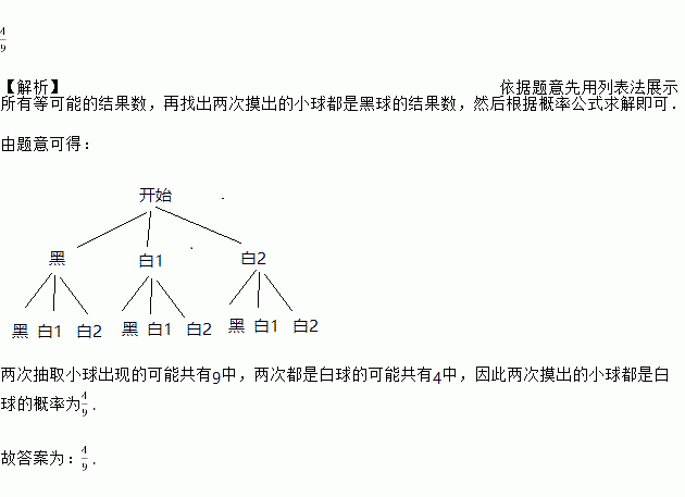 一个不透明的袋子中装有黑、白、白球共三个,这些小球除颜色外无其他差别,从袋子中随机摸出一个小球后,放回并摇匀,再随机摸出一个小球,则两次摸出的小球都是白球的概率为_______.