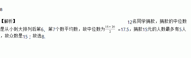 某班第一组12名同学在“爱心捐款”活动中,捐款情况统计如下表,则捐款数组成的一组数据中,中位数与众数分别是( )