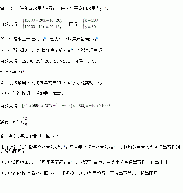(1)问:年降水量为多少万m3?每人年平均用水量多少m3?