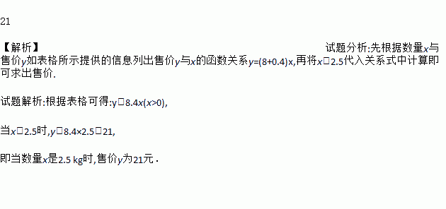 某商店售货时。在进价的基础上加一定利润,其数量x与售价y之间的关系如下表所示,请你根据表中所提供的信息,列出售价y与数量x之间的关系式,并求出当数量x=2.5 kg时,售价y是多少元.