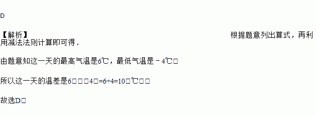 某市2016年的元旦的最高气温为6℃,最低气温为-4℃,那么这天最高气温比最低气温高( )